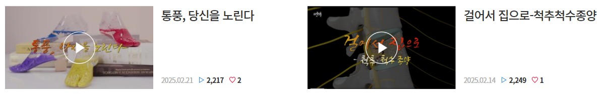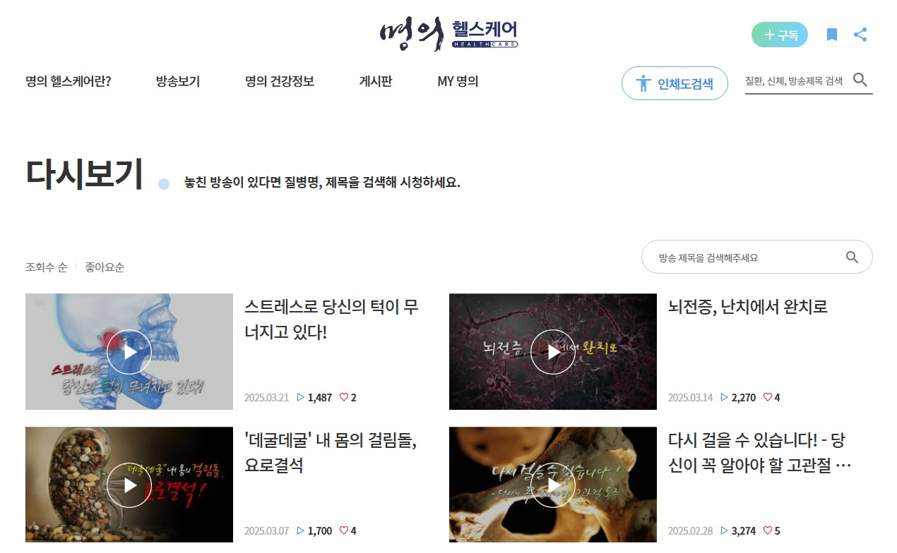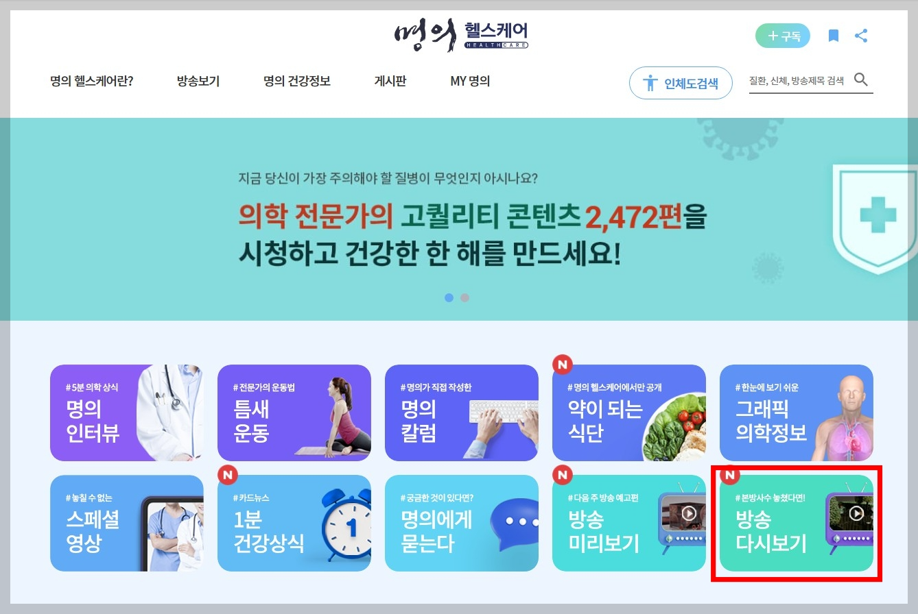 공식홈페이지를 잘 활용하시면 다시보기부터 다양한 의학정보까지 모두 확인할 수 있사오니 참고하시기 바랍니다.