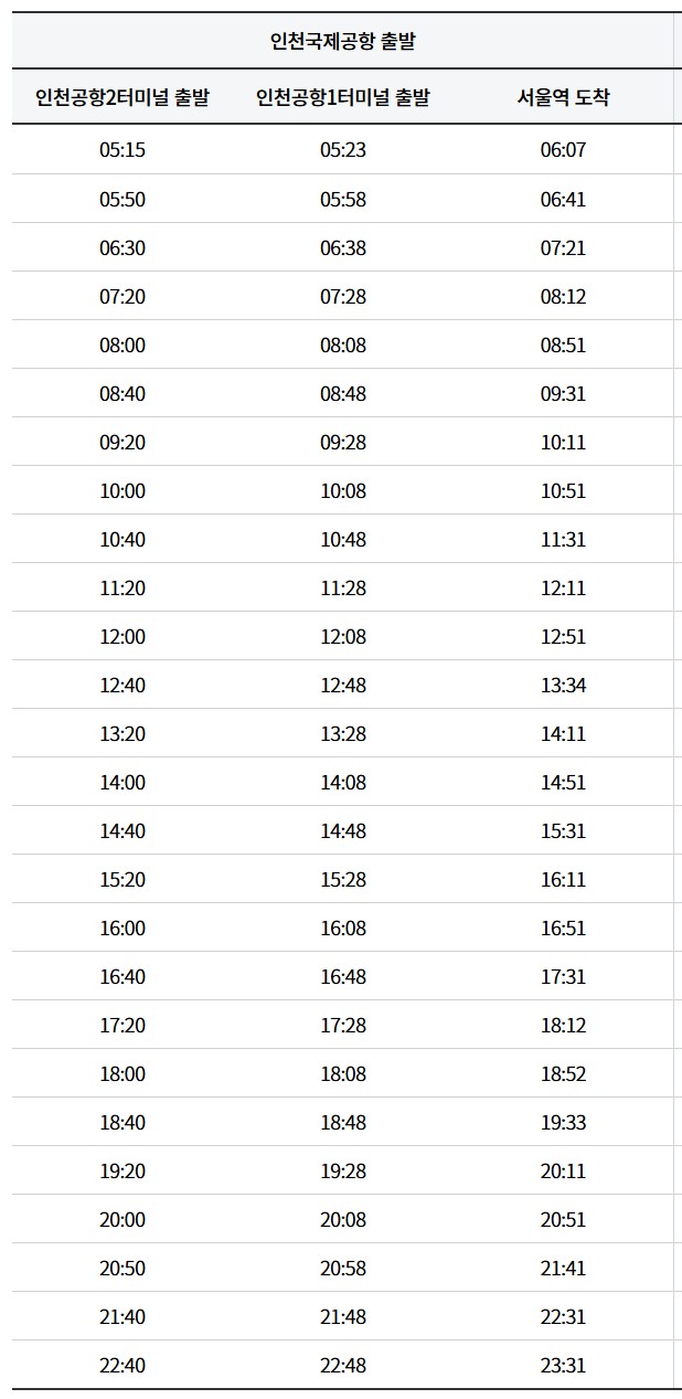 또한 인천국제공항 출발과 서울역 출발의 시간표도 나뉘어집니다.