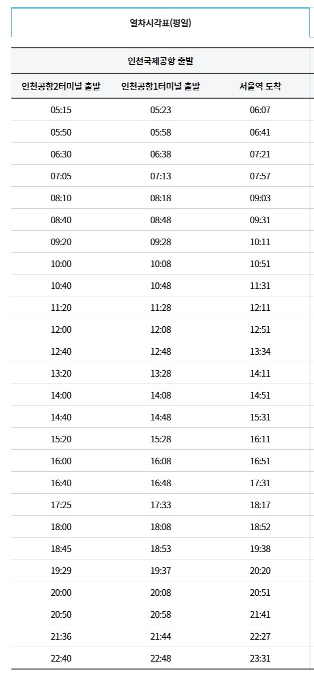 서울역 출발-> 인천공항 1터미널 도착-> 인천공항2터미널 도착 하는 열차 시각표는 아래와 같습니다.