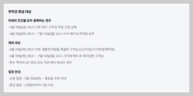 쉽게 말하면, 4월19일부터 7월 14일까지 SKT를 해지한 사람들 가운데 위약금을 납부했다면, 그 위약금을 돌려주겠다는 말입니다.